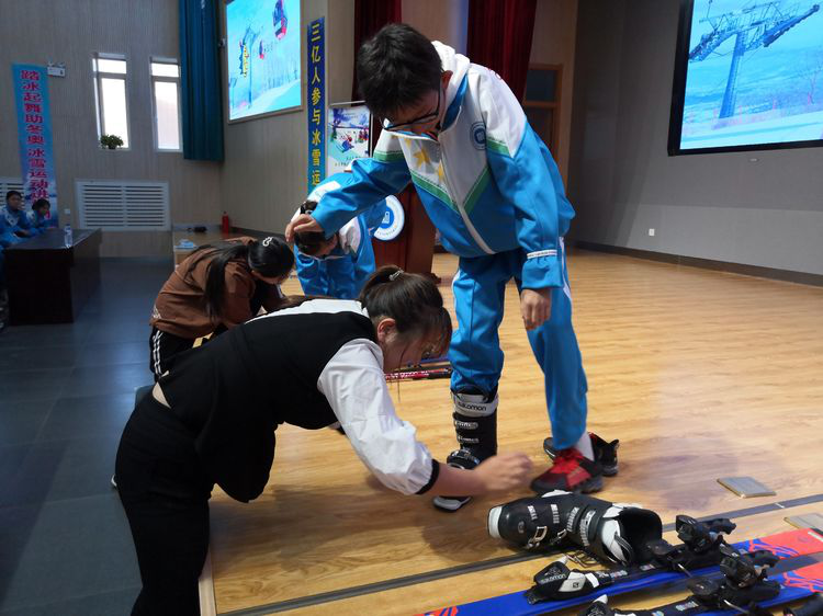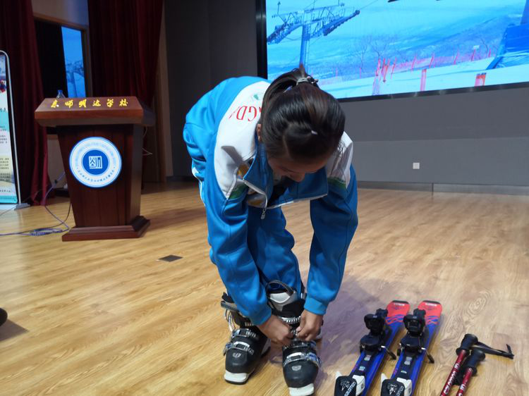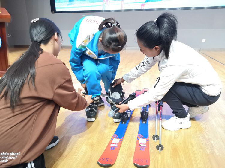 躍躍欲試的同學們在冰雪講師的指導下親身體驗滑雪裝備的魅力,興奮不已。